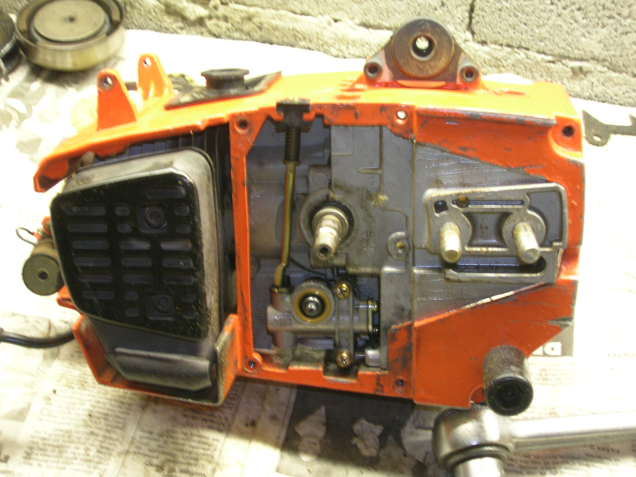 , voici à quoi ressemble le bloc moteur.On peut encore distinguer la liaison caoutchouc servant d'interface souple entre le carburateur et le bloc cylindre.