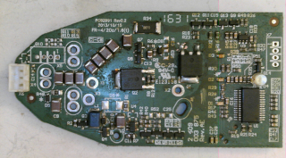 vue de la carte de circuit imprimé...Qu'à cela ne tienne, direction le Labo pour chercher d'où peut bien venir le problème. Une fois l'engin démonté (9x vis TORX T10 à ôter...) on peut distinguer sur la carte de circuit imprimé un micro-contrôleur PIC16F882 et deux transistors en boitier DPAK ayant le marquage BA6R18. Il s'agit là de deux MOSFET canal N de puissance que je vais m'empresser de remplacer car l'un des deux (Q1) est fendu juste au-dessus de la broche Source... Rien d'autre ne semble abimé ou détruit... cela aurait pu être plus grave !