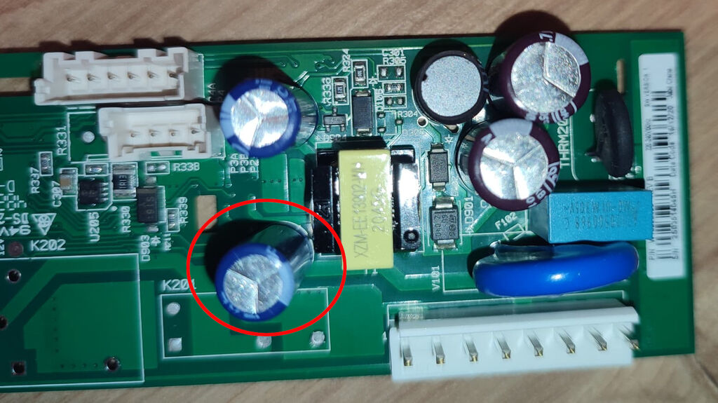 N'ayant pas trouvé d'autre défaut remarquable, j'ai remplacé la diode par le même modèle et le condensateur par un 470 µF /35V-105°C que j'avais acheté chez Farnell, ce modèle par exemple (avec une tension de service supérieure à celui monté d'origine...). Ce condensateur (de marque AiSHi...) je l'ai bien entendu contrôlé avec mon capacimètre et j'ai même testé son ESR, tout semblait correct à prioiri... la valeur lue était de 455 µF avec une valeur ESR proche de 0 Ω... sauf que les appareils de mesure utilisent de trop faibles tensions pour pouvoir déceler une fuite sous la tension nominale du composant.