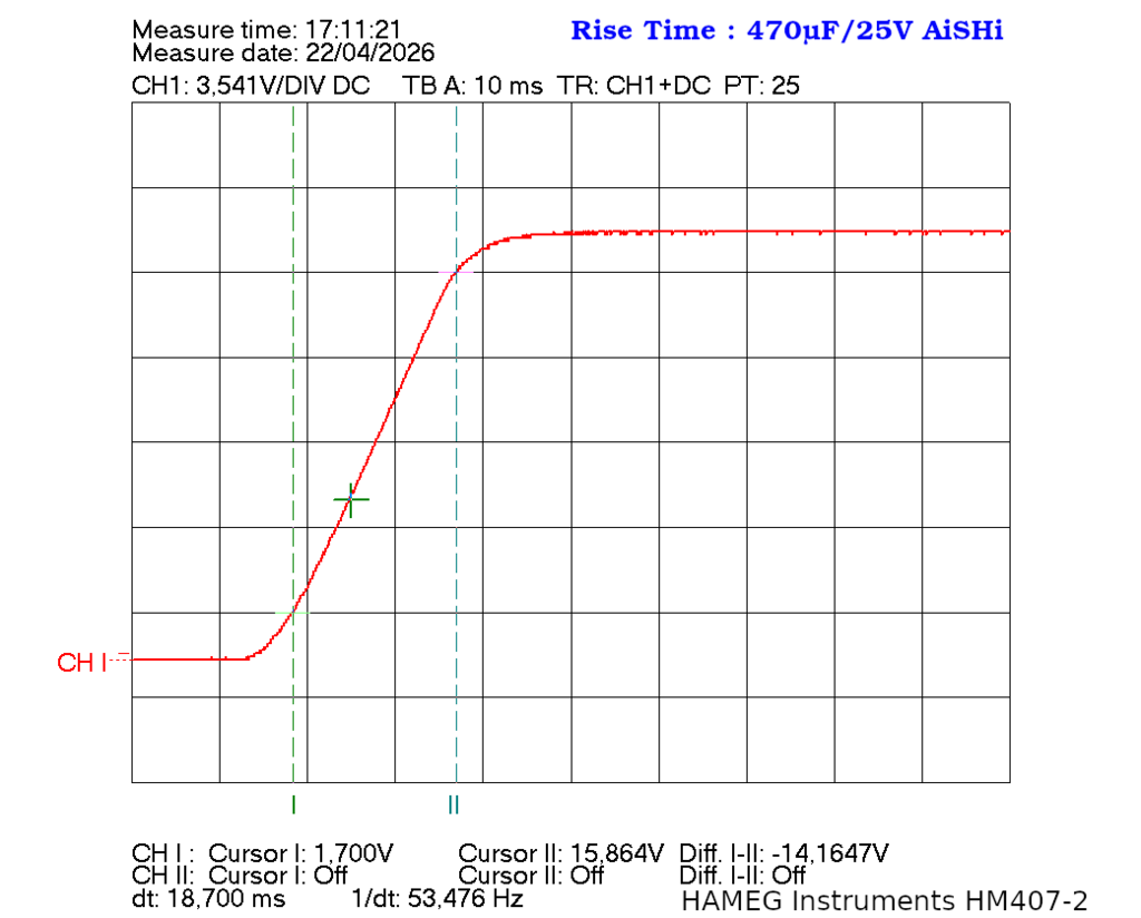 Après le remplacement de ces deux composants l'appareil a pu être remis en marche et les tensions de +12V et +5V valaient alors +13,46V et +5,02V, rien de surprenant ici (je précise que le compresseur n'avait alors pas encore démarré...). J'ai également mesuré le temps de charge du condensateur d'origine à l'aide de mon alimenattion de Labo réglée à +12V / 4A. Le temps de montée (= temps de charge) ainsi mesuré était de 18,7 ms, la courbe obtenue est visible en Figure 9. C'est correct mais j'ai préféré tout de même remplacer ce condensateur par un modèle que j'ai déjà éprouvé !